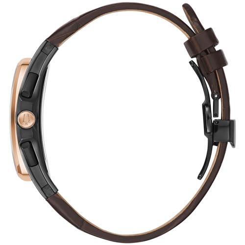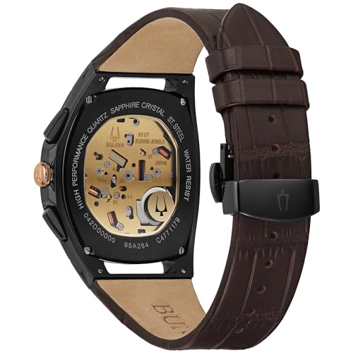 Bulova Men’s CURV High Performance Quartz Black and Rose Gold-Tone Stainless Tonneau Shape Case,Brown Leather Strap Watch, 5-Hand Chronograph, Sapphire Crystal Style: 98A264