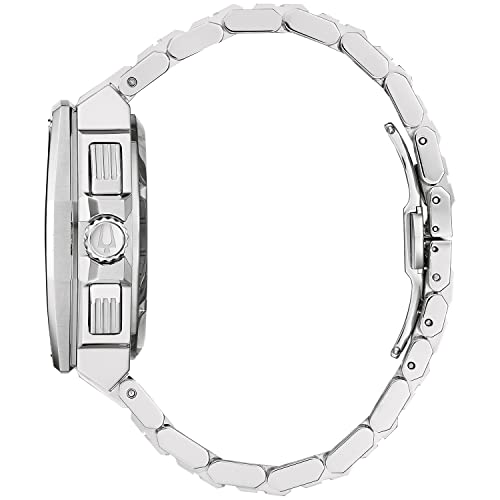 Blue (Cut Out) dial enhanced by luminous silver-tone hands. Silver-tone stainless steel case with a silver-tone stainless steel band. Quartz movement. 300 meters / 1000 feet water resistance. Fixed bezel. Scratch Resistant Sapphire crystal. Solid caseback. Deployment clasp. Screw Down crown. Case size 44.5 mm x 17.35 mm. Bulova 96B349 Precisionist Watch.